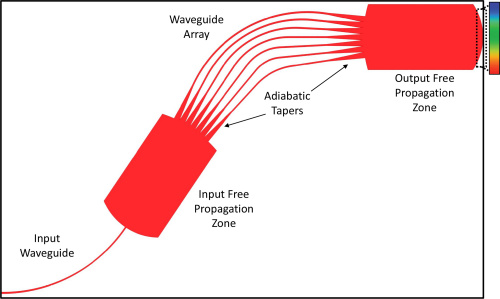 AWG 的工作原理如下(见图):光通过单模波导注入大的自由传播区 (FPZ)。FPZ 是大的折射率修改区域,使光能够在水平面内自由衍射,同时被限制在垂直面内。然后通过锥体阵列同相捕获该平板模式。这些锥度绝热地将平板模式引导到波导阵列中,从而减少模式失配,从而减少损耗。阵列的每个波导都比相邻的波导逐渐长,从而在波导阵列上产生类似于体衍射光栅的相位倾斜。然后,这些波导被注入第二个 FPZ,其中每个波长的光发生相长干涉,在输出处产生水平分散的光谱。AWG 类似于衍射光栅,根据设计,输出可能有多个衍射级。