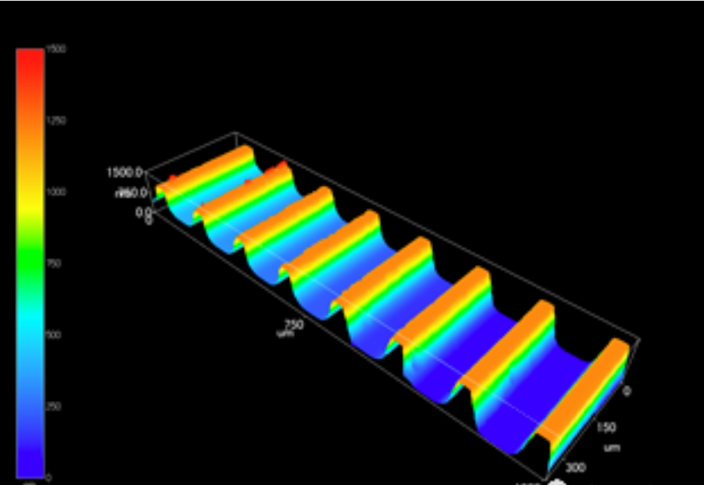 分析得到的膜厚分布图像断面图如图7。各凹槽测量位置的深度,与指定区域的平均值基本一致。斜面处反射光无法正常检测的部分,出现噪声干扰,设定亮度阈值可对噪声判定为异常值后进行处理。处理后得到的断面图如图8。可进一步得到3D图像进行直观观察(如图9)。