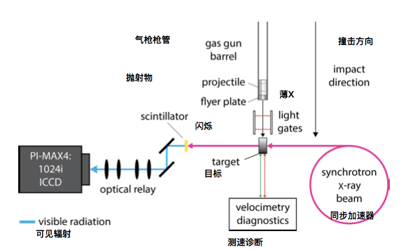 2.如下图实验建设;冲击速度范围为 250-850ms-1,产⽣的冲击压⼒和材料运动分别为5-20GPa和数百ms -1。 在撞击之后,通过⾼能量(50-250keV)X射线照相 和互补速度诊断检查⽬标损伤,使用高能同步辐射X射线照相术来研究高Z材料中的冲击引起的变形;这项研究的关键是普林斯顿仪器PI-MAX4:1024i增强型CCD(ICCD)相机,配备Gen III无膜增强器,可在低光子情况下实现快速成像,PI-MAX4:1024i将传统的像增强器门控选通达到500ps,而不牺牲量子效率。