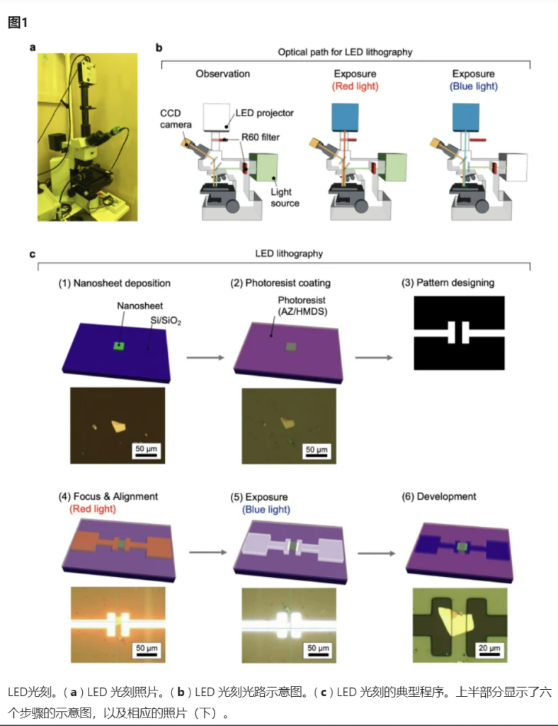 传统的 EB 光刻通常会导致无意的杂质掺杂和晶体损坏,从而降低电子特性。在此背景下,LED光刻技术颇具特色。由于此方法使用蓝色 LED 组件,因此可以实现温和的光刻,避免 EB 光刻中经常遇到的可能的光束损坏。我们的 LED 光刻系统简单且价格低廉,只需将普通光学显微镜与市售 LED 投影仪相结合即可。这是与传统电子束光刻相比的一大优势;商业应用中使用的典型 EB 光刻系统非常昂贵(> 100 万美元)。LED 光刻技术为器件制造提供了一种经济高效的光刻技术,无需任何昂贵的仪器、高真空或复杂的操作。