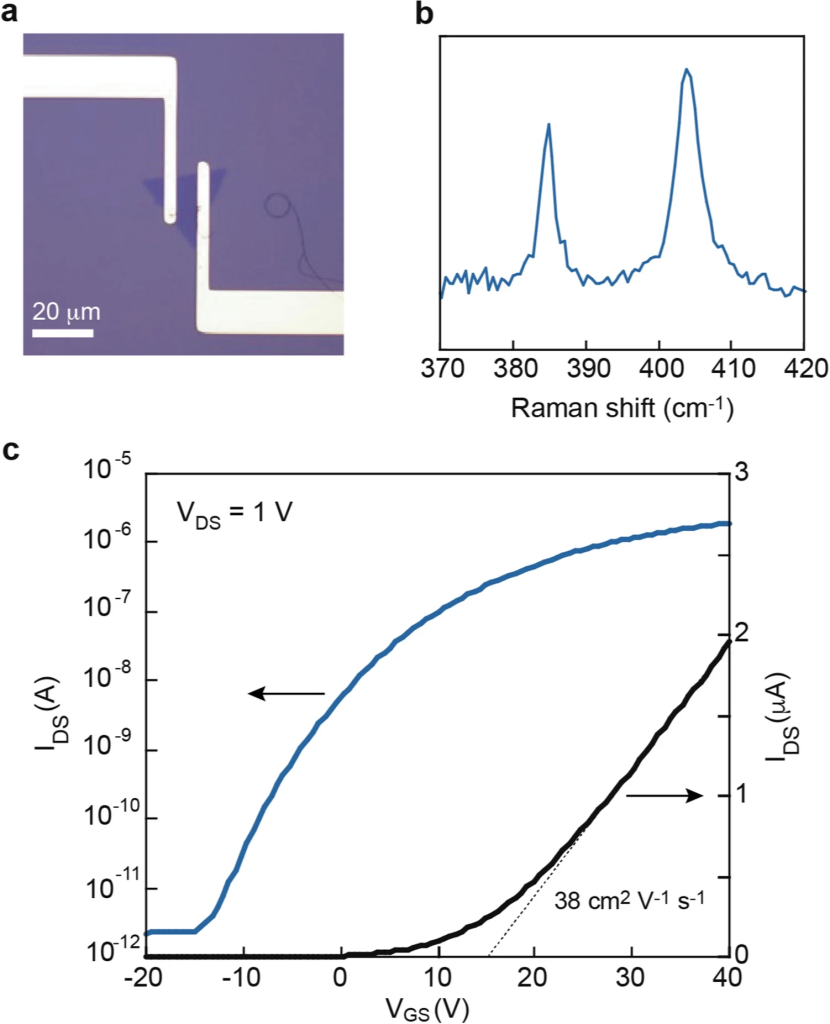 图5,通过 LED 光刻技术制造的 FET 器件。( a ) 290 nm-SiO 2 /Si 上的 1 L MoS 2 FET 。( b ) 取自单层 MoS 2器件的拉曼光谱。( c )在室温下从单层 MoS 2器件测量的转移曲线。