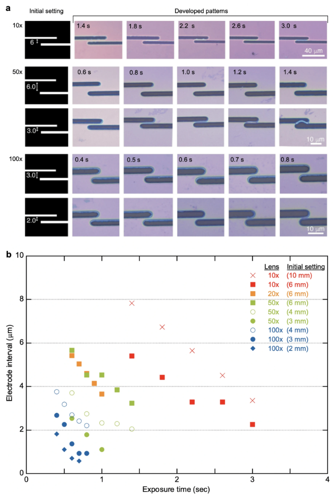 图案化能力。( a ) 与最初设计的图案(左)相比,开发的图案对曝光条件的依赖性。采用不同物镜(×10、×50 和×100)和不同曝光时间的 LED 光刻法制作的两个电极。( b ) 电极间隔与曝光时间的关系。我们评估了由具有不同初始设置的不同物镜制造的电极间隔。