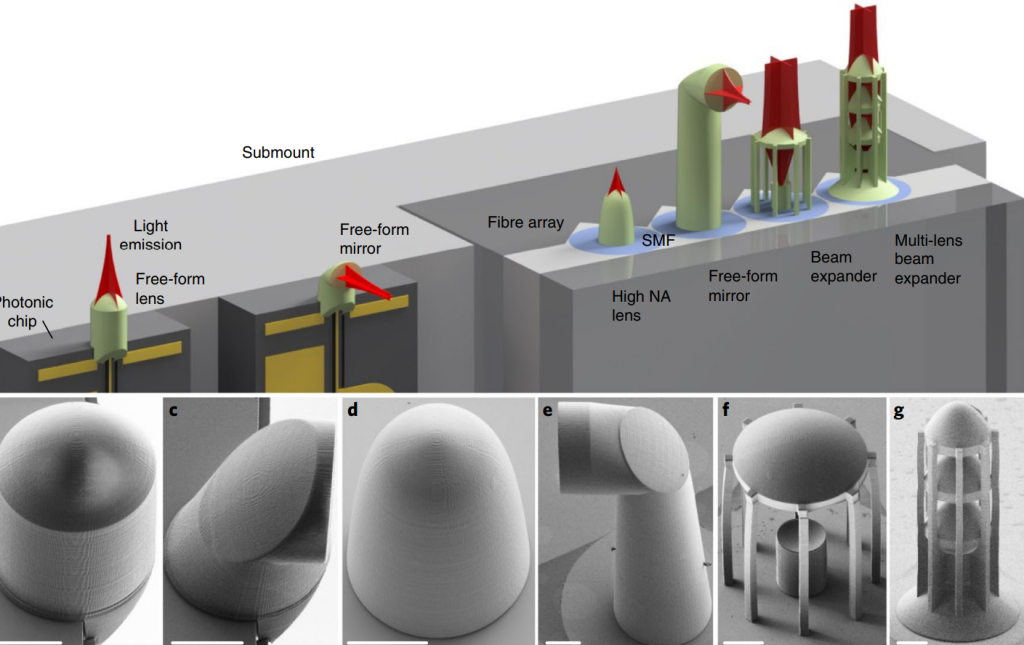 飞秒激光直写3D打印用于芯片和光纤端面的一系列光束整形元件,可实现边缘发射激光器和单模光纤之间高达 88% 的耦合效率;同时适应光束形状和传播方向的印刷自由曲面反射镜。