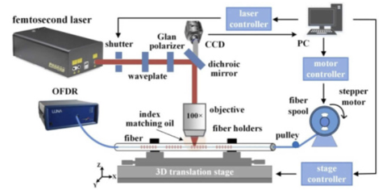 采用倍频再生放大 Yb:KGW 飞秒激光器,波长为 514 nm,脉冲宽度为 290 fs,重复率为 200 kHz激光源。使用波片和格兰偏振器来调节激光束的光功率和偏振。二向色镜用于将激光束反射到物镜并将可见照明光束传输到 CCD。采用徕卡油浸物镜(100×,NA=1.25)将激光束聚焦到纤芯中心,并在光纤与物镜之间涂抹折射率油(n≈ 1.4587),像差由圆柱形纤维几何形状引起的影响可以最小化。具有聚合物涂层的传统 SMF(康宁 SMF-28)由安装在 3D 高精度空气轴承平移台(由 Aerotech ABL15010、ANT130LZS 和 ANT130V-5)上的一对光纤支架固定。
