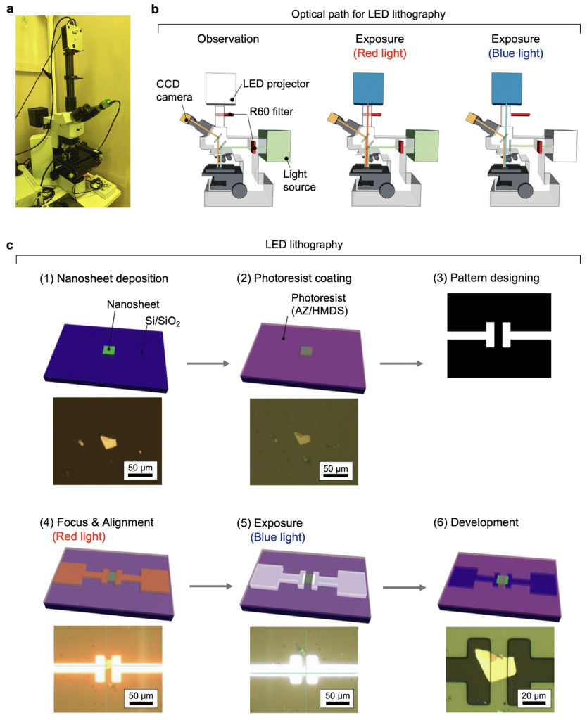 - 因为可以在普通的室内环境中在各种大小盒形状的单晶薄片上形成电极,所以它比电子束光刻便宜且简单,不需要制造昂贵的电极图案掩膜板。